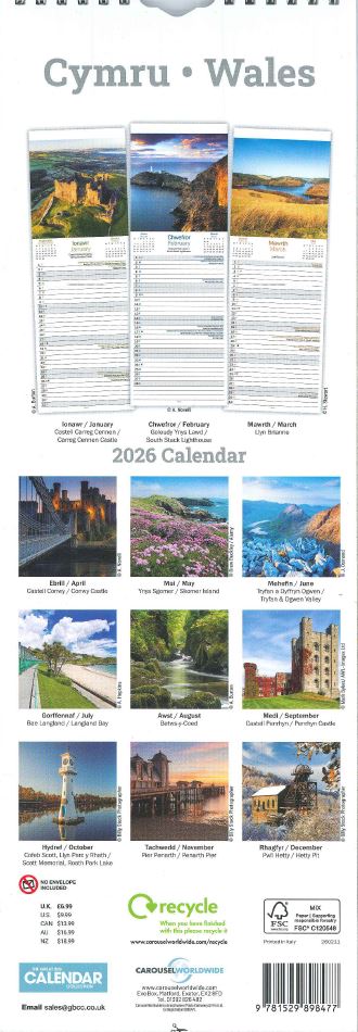 This ring bound 2026 slim calendar with bilingual text features twelve beautiful images from around Wales - from the lush views of Betws-y-Coed in North Wales to the pretty landscape of Skomer Island off the Pembrokeshire Coast.