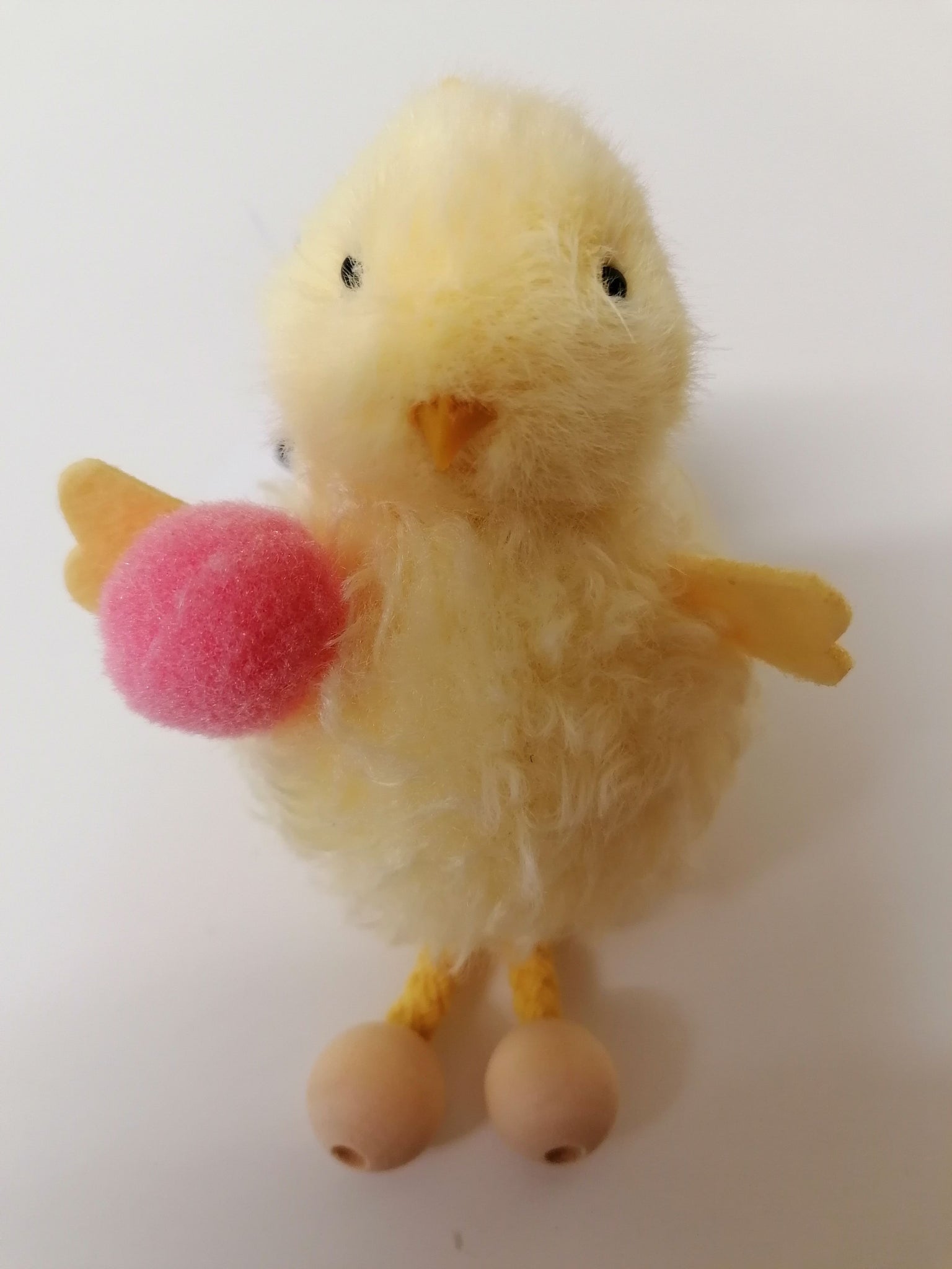 This sweet 'fluffy chick' holds a pink pom pom in his little wings, made from a soft fluffy fabric with adorable dangling legs and a ribbon for hanging, this beautifully crafted decoration would be a lovely gift to give this Easter.
