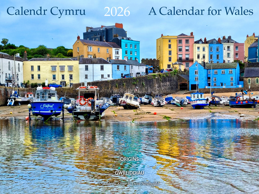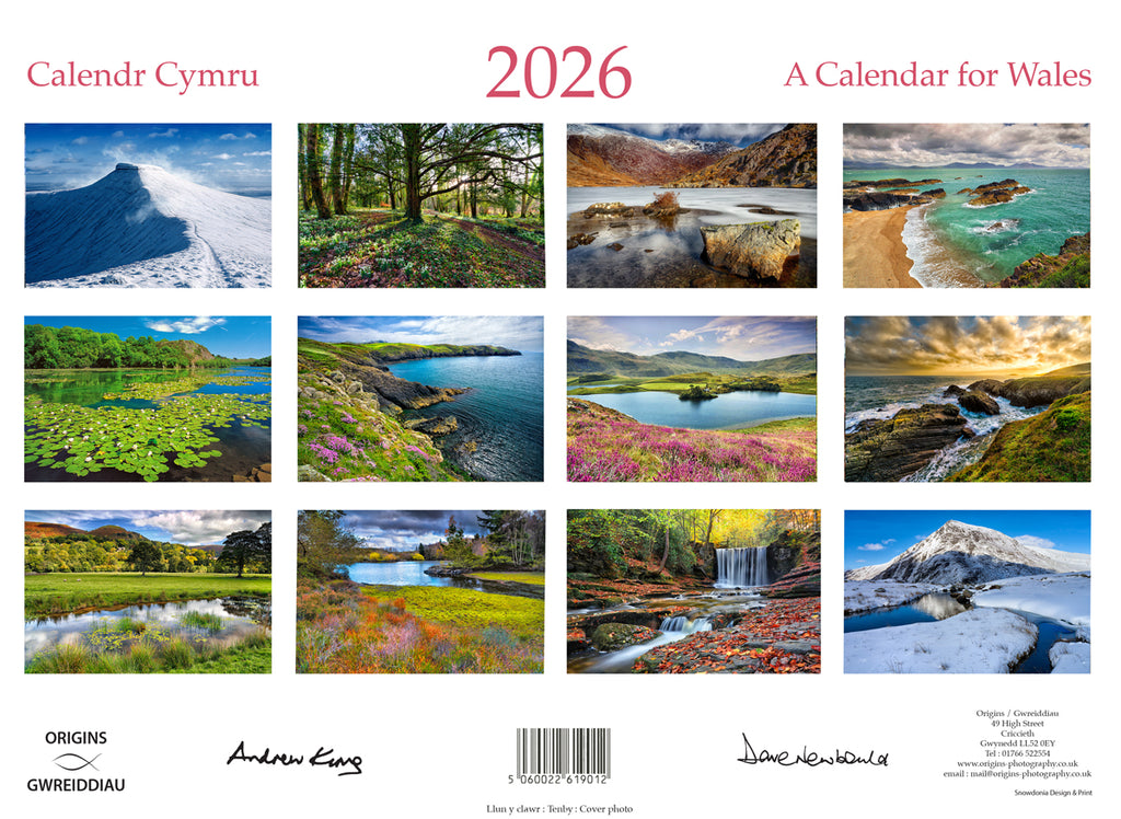 Calendr 2026 gan Origins Photography efo testun dwyieithog ac yn cynnwys deuddeg delwedd hardd o dros Gymru - o uchelfannau Pen y Fan, i dirwedd garw Porth Clais. Maint y calendr pan gaiff ei blygu yw 320mm x 240mm, ac yn agor allan i ddwbl y maint hwn - mae'r llun ar yr hanner uchaf a'r dyddiadau ar yr hanner gwaelod, gyda digon o le i ysgrifennu dyddiadau ac apwyntiadau.